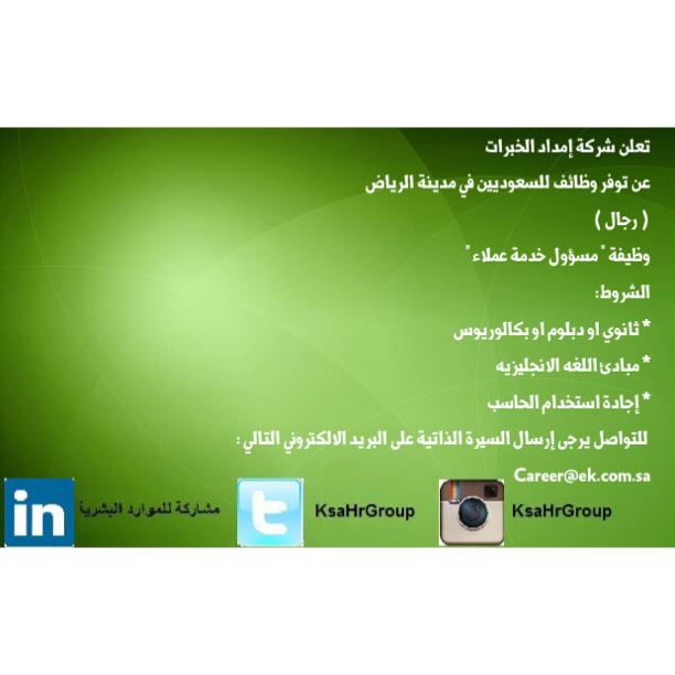 مشاركةللمواردالبشرية En Twitter تعلن شركة إمداد الخبرات عن توفر وظائف للسعوديين في الرياض رجال وظيفة مسؤول خدمة عملاء Career Ek Com Sa Http T Co Xcial5brlo