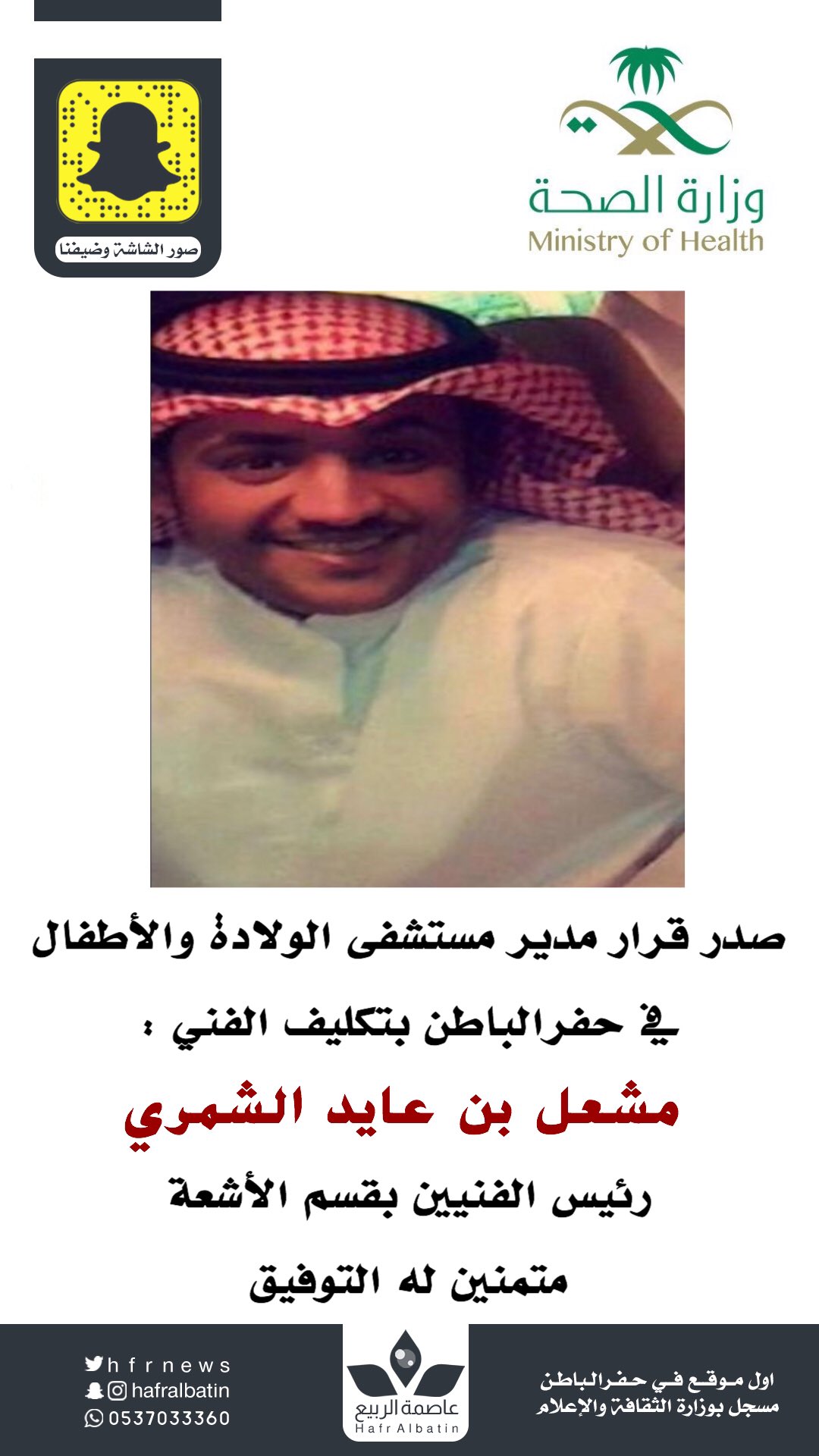 عاصمة الربيع On Twitter صدر قرار مدير مستشفى الولادة والأطفال في حفرالباطن بتكليف الفني مشعل بن عايد الشمري رئيس الفنيين بقسم الأشعة متمنين له التوفيق عاصمه الربيع Https T Co Gnabjcogdf